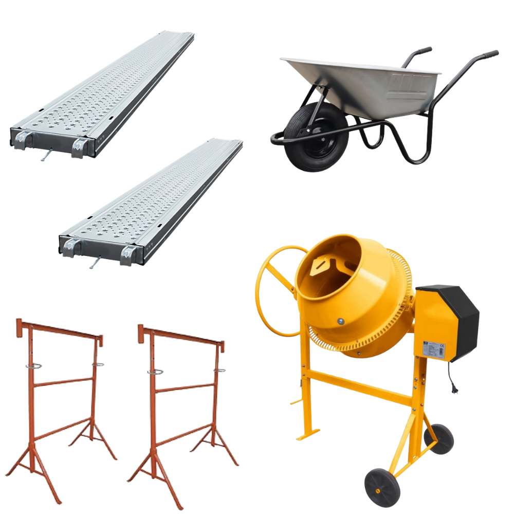 Louez le pack maçonnerie complet, idéal pour vos travaux de construction et de rénovation. Ce pack regroupe une brouette professionnelle, une bétonnière électrique 125L, deux plateaux galvanisés de 3 mètres et deux tréteaux robustes. Tout le nécessaire pour travailler efficacement sur vos chantiers de maçonnerie.